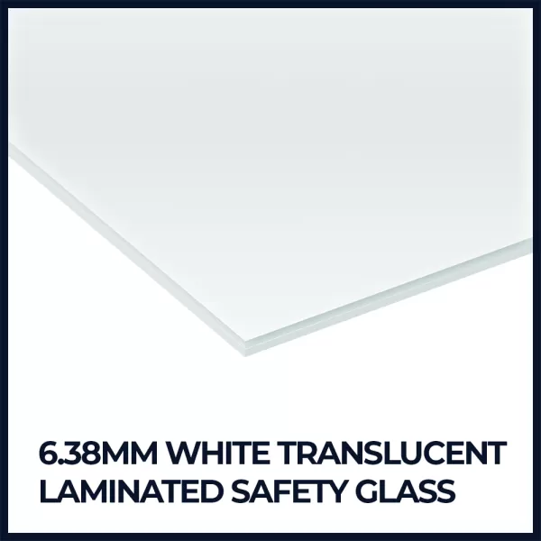 We stock 6.38mm White Translucent Laminated Safety Glass in large sheet form to be cut to size and fitted.